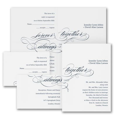 There are also elegant invitations with matching RSVP’s that follow the original pricing plan, with a price for the invitation and a price for the RSVP. The exception to this style is that the envelopes, both RSVP and outer envelope, are included in the pricing.